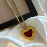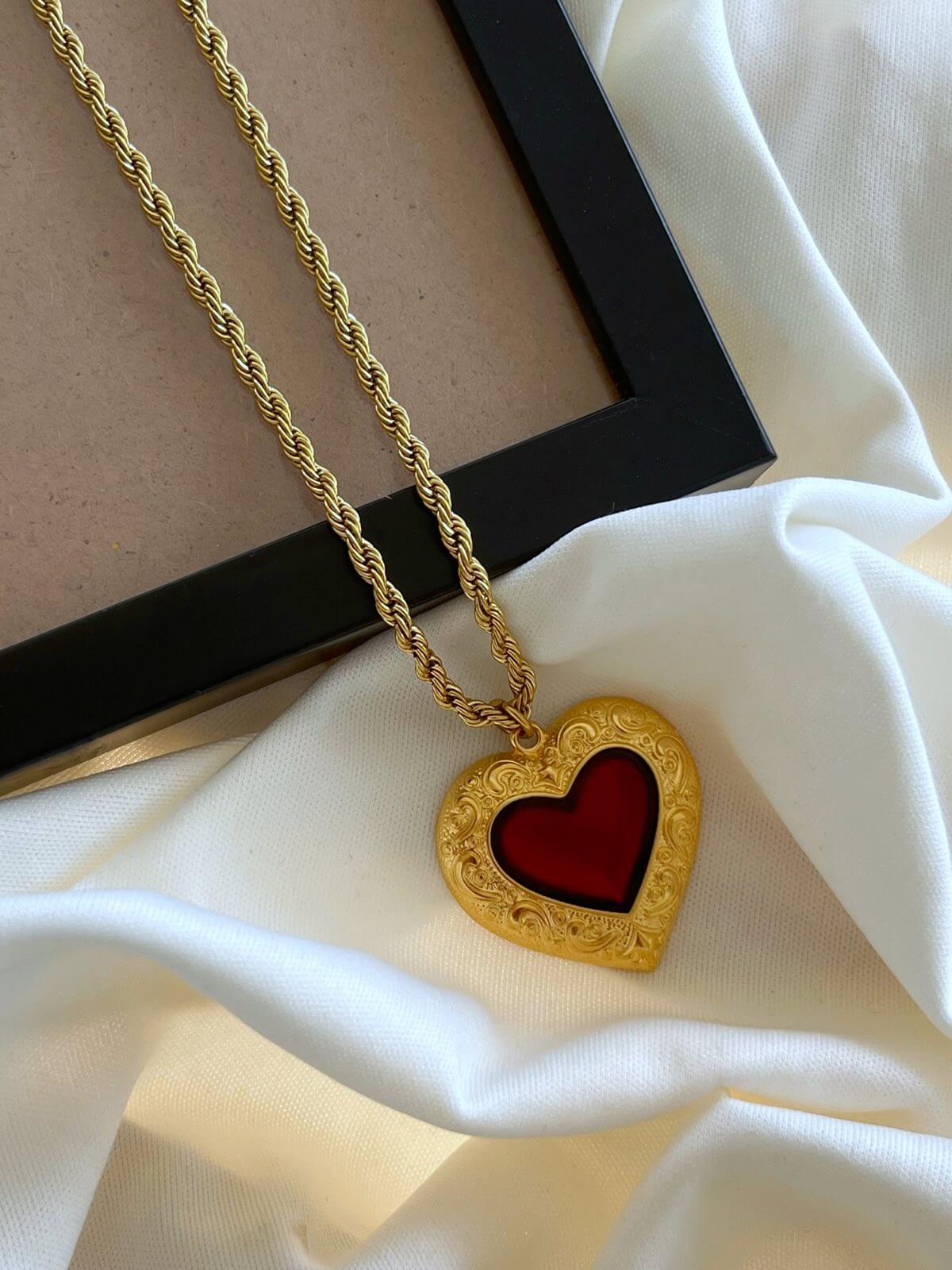 • Ατσάλινη αλυσίδα με ανάγλυφη καρδιά από επιχρυσωμένο ορείχαλκο με κόκκινο-βουργουνδί σμάλτο