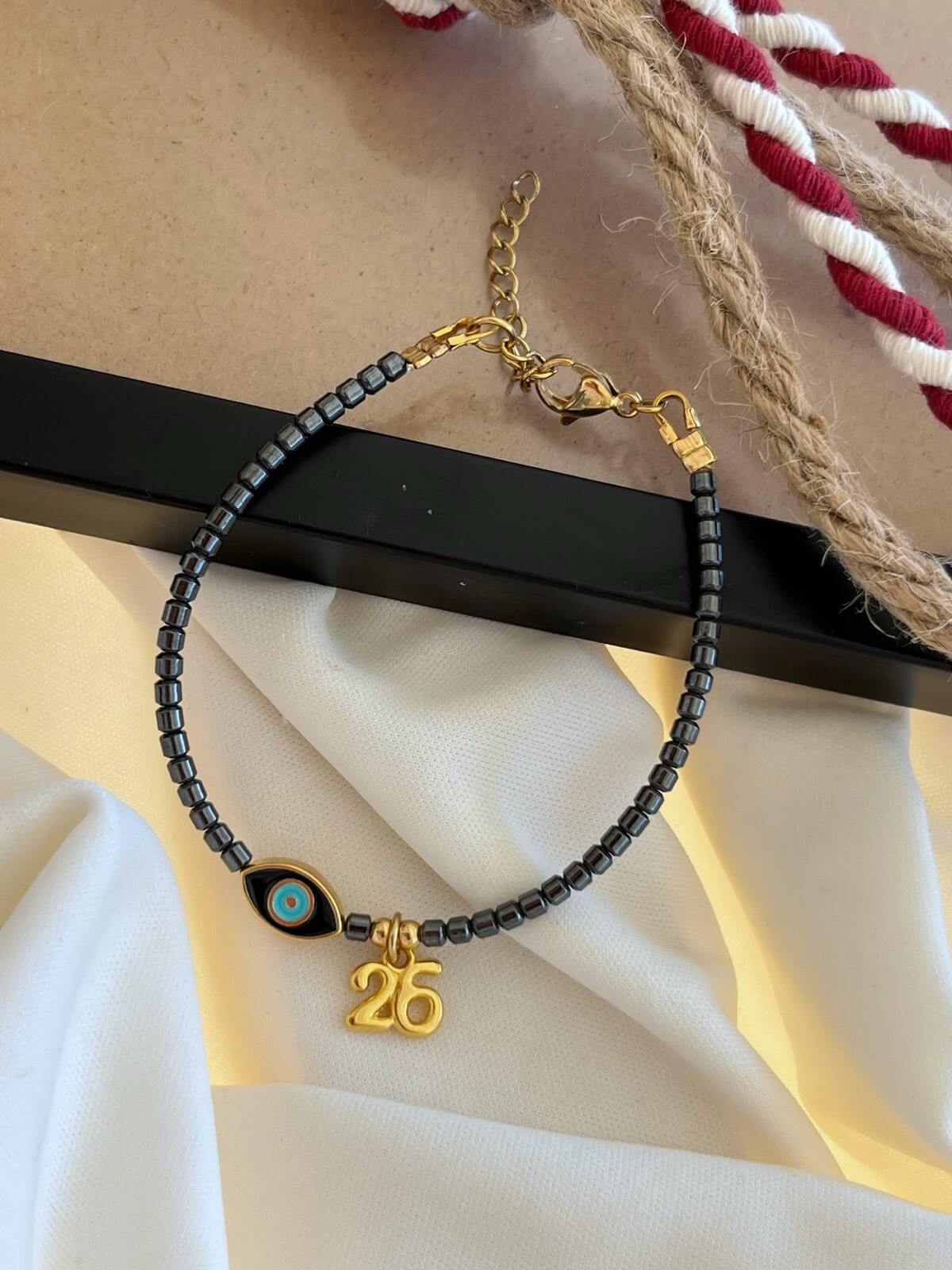 • Βραχιόλι με ημιπολύτιμες πέτρες αιματίτη και ματάκι με σμάλτο