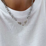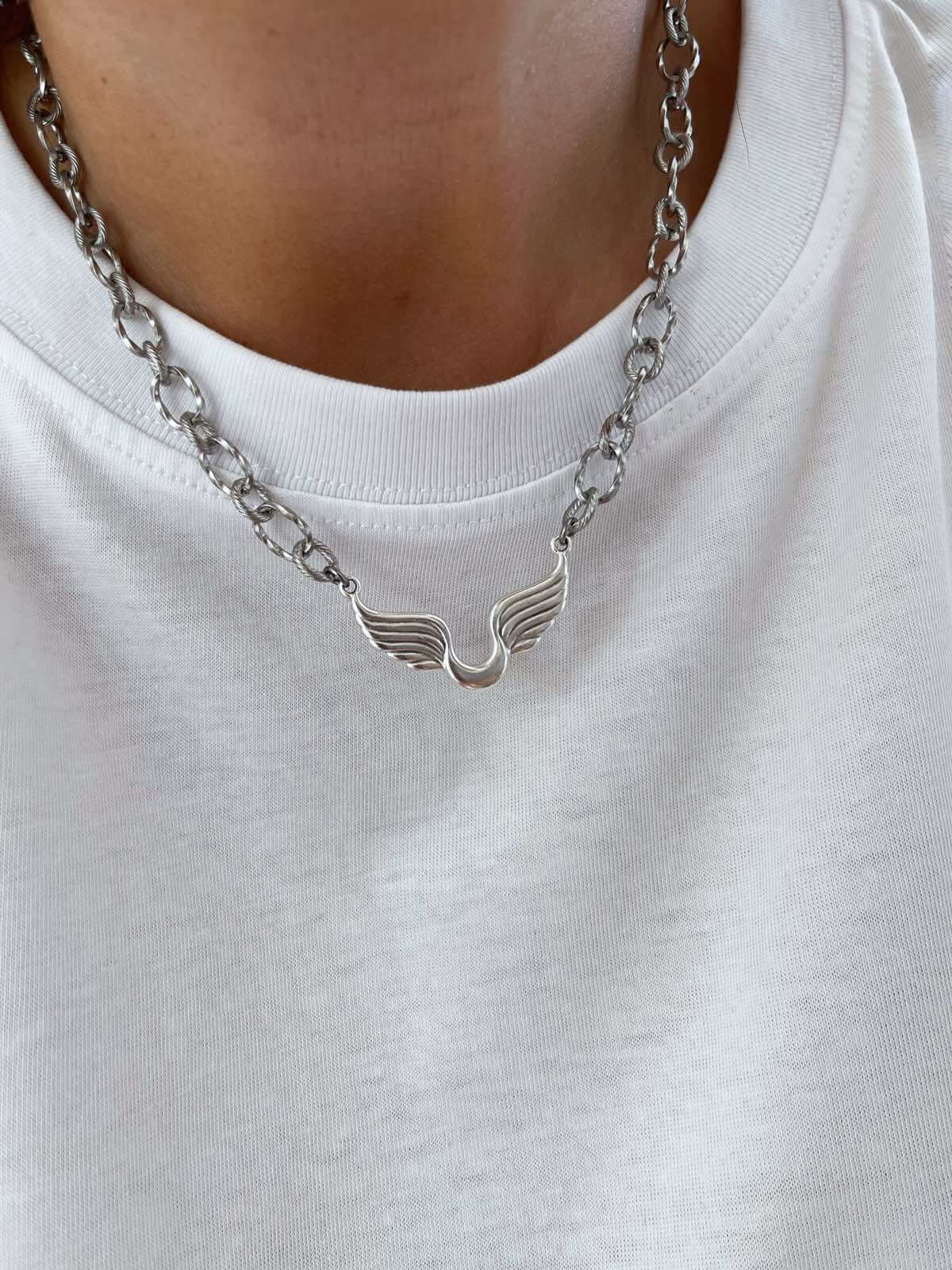 • Κολιέ με ατσάλινη αλυσίδα κ επαργυρωμένο με ασήμι στοιχείο φτερά από ορείχαλκο