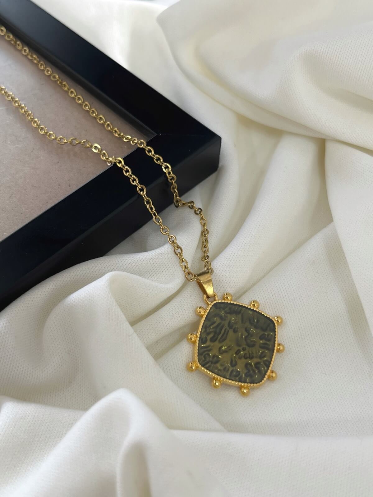 • Κολιέ με ατσάλινη αλυσίδα κ ορειχάλκινο επιχρυσωμένο στοιχείο με khaki σμάλτο